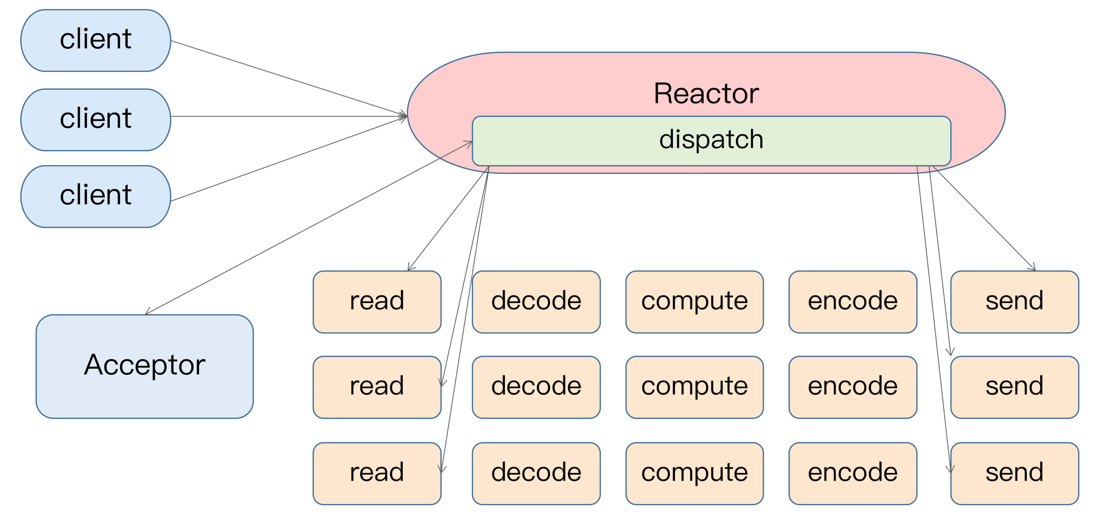 Reactor 模式是事件驱动架构的一种实现方式,特别适合应用于处理多个客户端并发向服务器端发送请求的场景。
