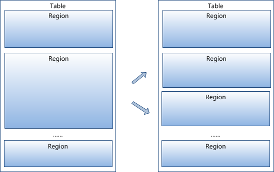 每个表一开始只有一个 Region,随着数据不断增加,Region 会不断增大,当增大到一个阀值的时候,Region 就会等分为两个新的 Region。当 Table 中的行不断增多,就会有越来越多的 Region。