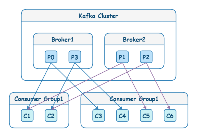 - 消费者组(Consumer Group):由多个消费者组成,一个分区只能被组内一个消费者消费,从而实现横向扩展和负载均衡。