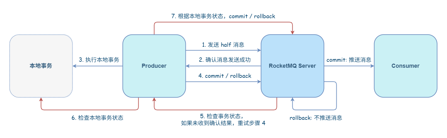 核心机制 | 数据库事务 + 定时任务扫表 | 半消息 + 事务回查 |